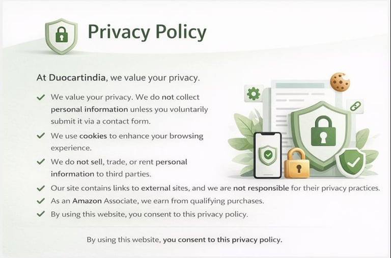 At Duocartindia, we value your privacy. We do not collect personal information unless you voluntarily submit it via a contact form. We use cookies to enhance your browsing experience. We do not sell, trade, or rent personal information to third parties. Our site contains links to external sites, and we are not responsible for their privacy practices. As an Amazon Associate, we earn from qualifying purchases. By using this website, you consent to this privacy policy.